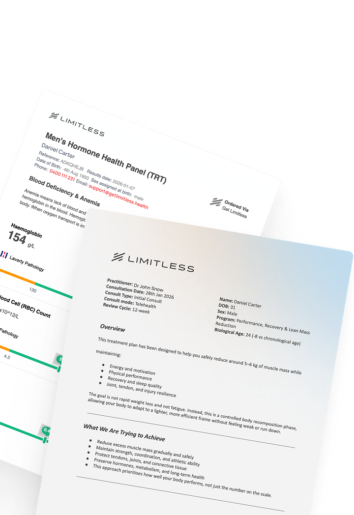 Get Limitless is a diagnostic-led preventative health platform. We use pathology, clinical assessment and practitioner oversight to guide personalised health plans focused on long-term optimisation of weightloss, hormone, metabolic and muscle health.